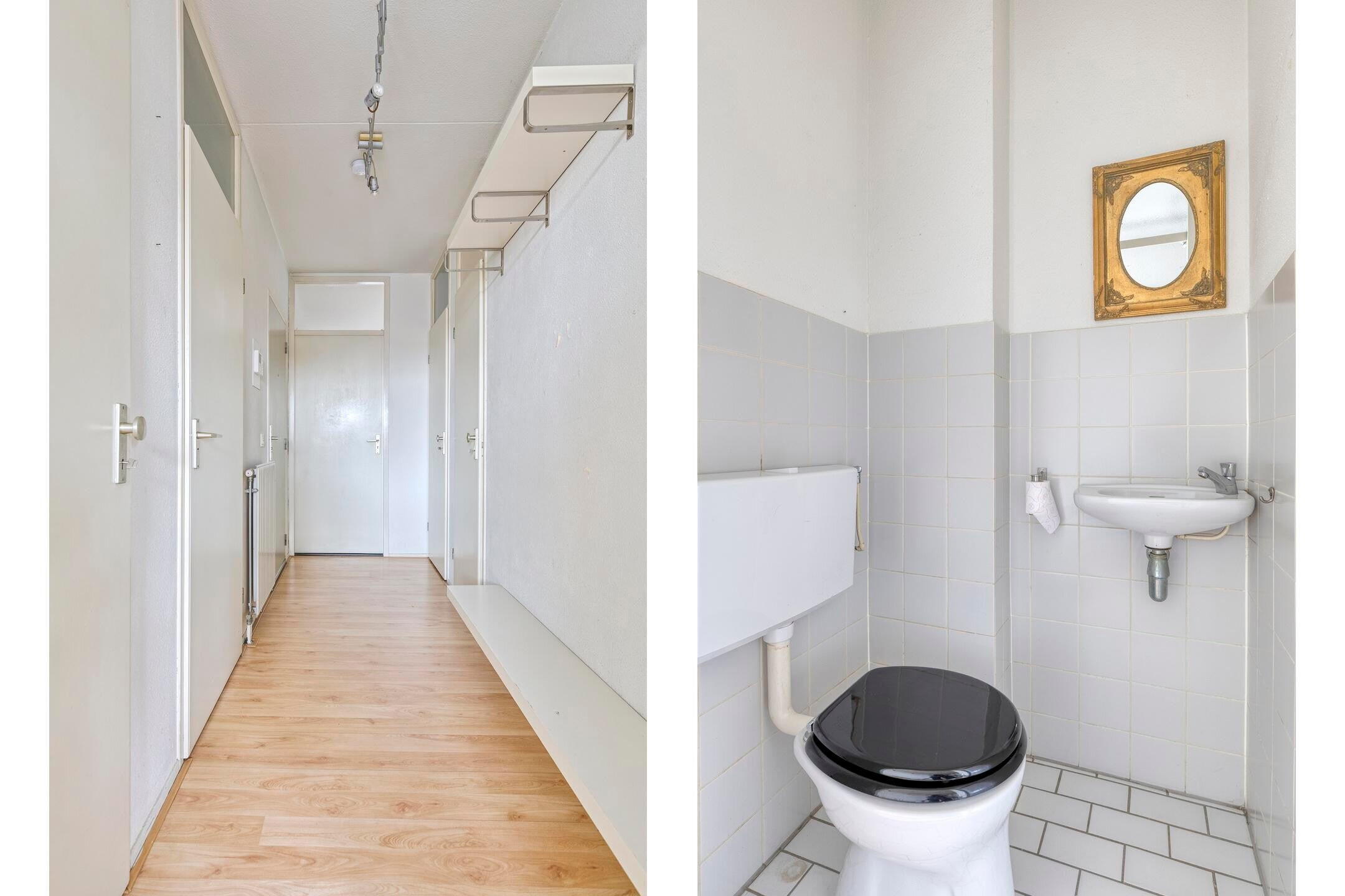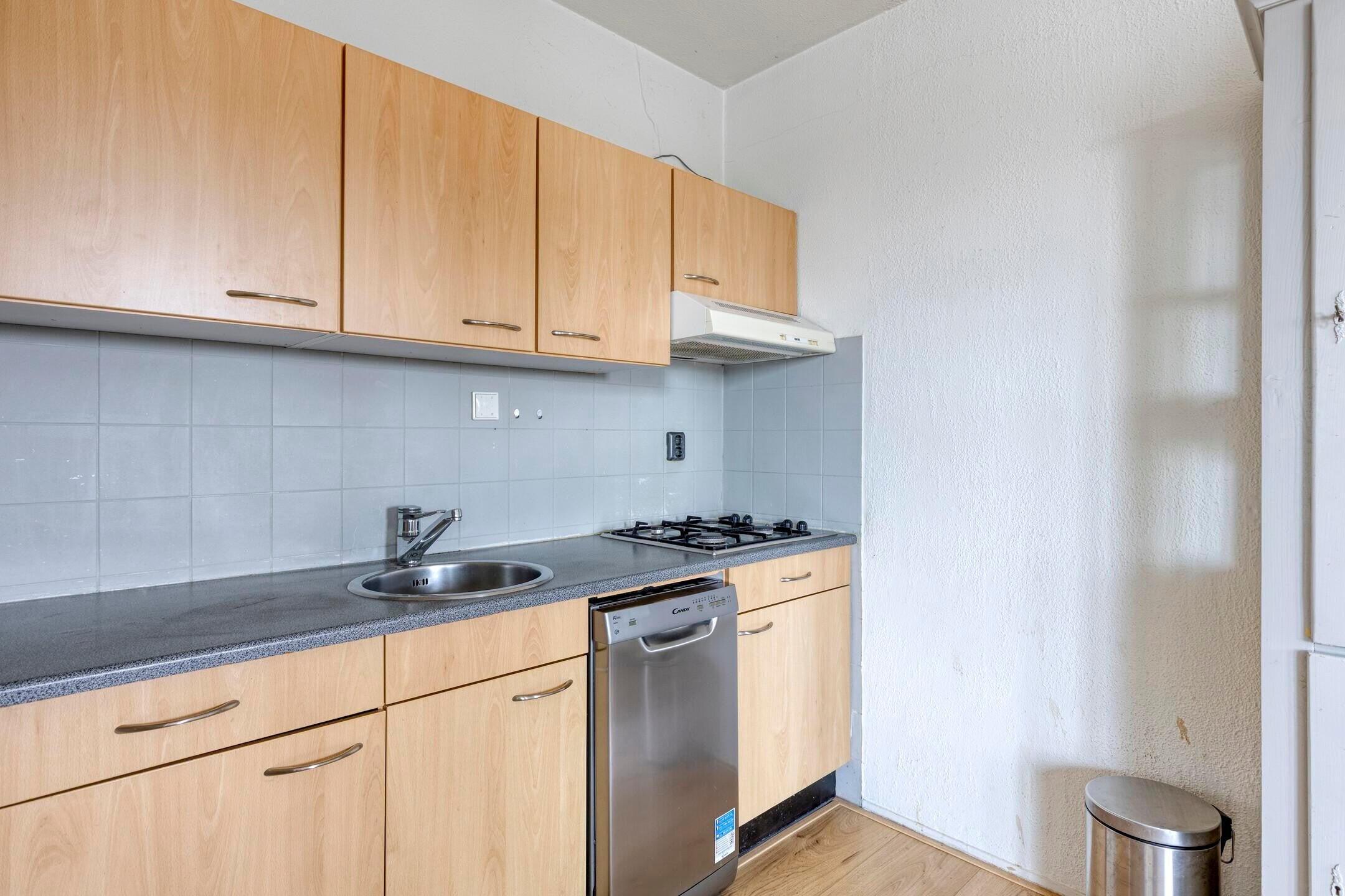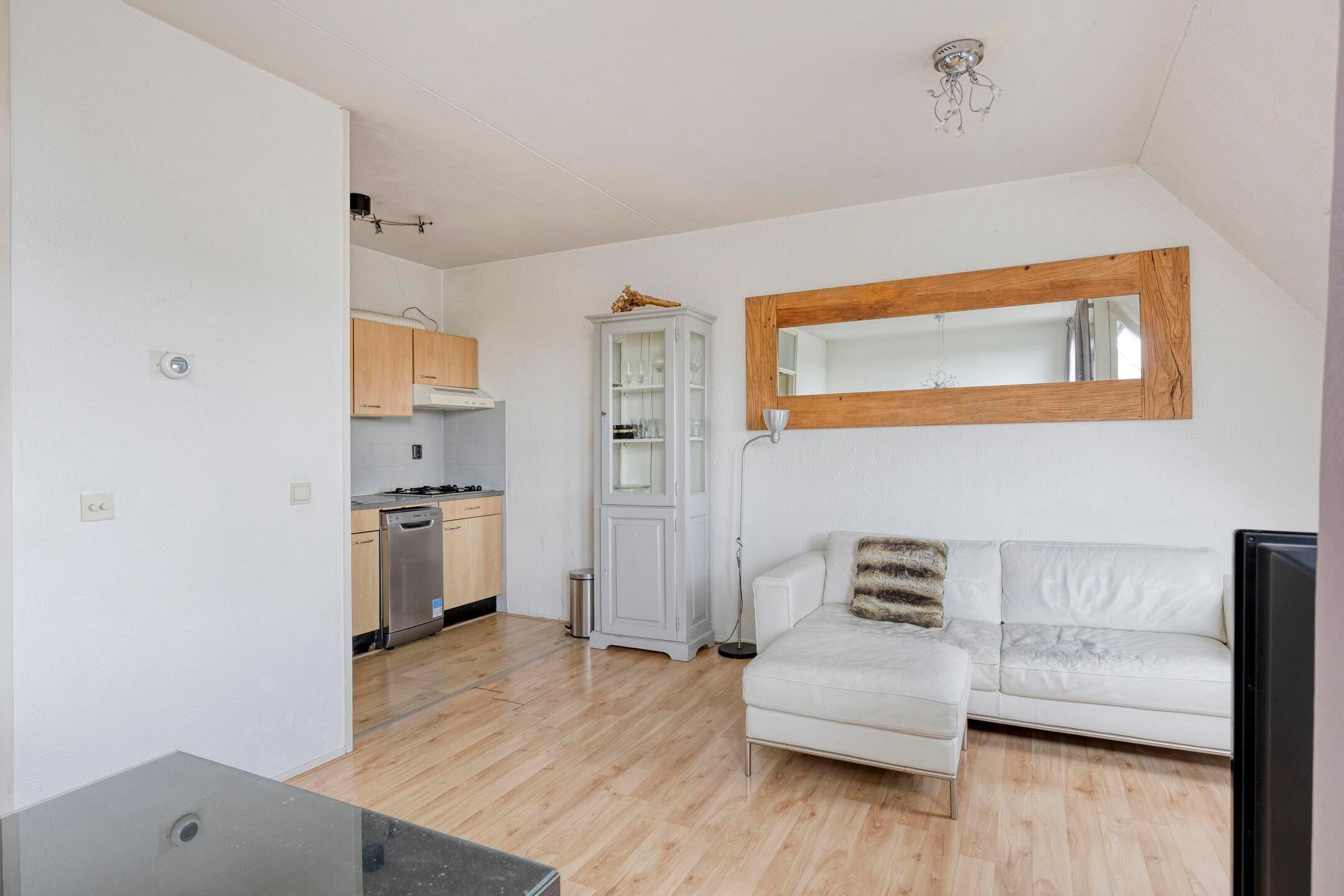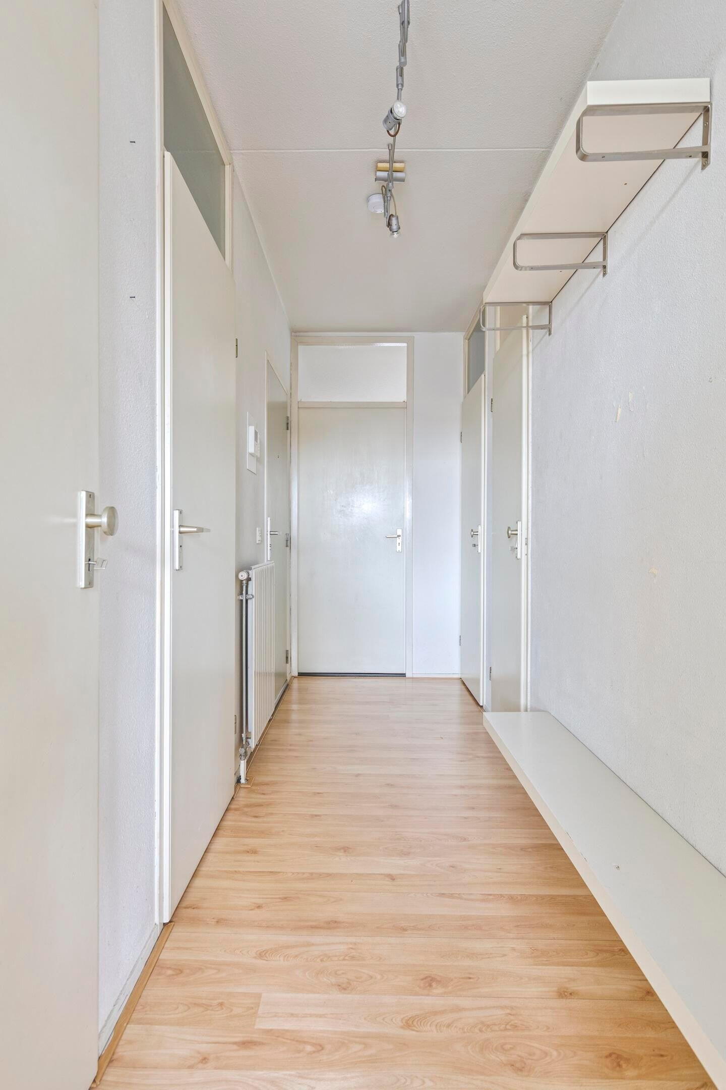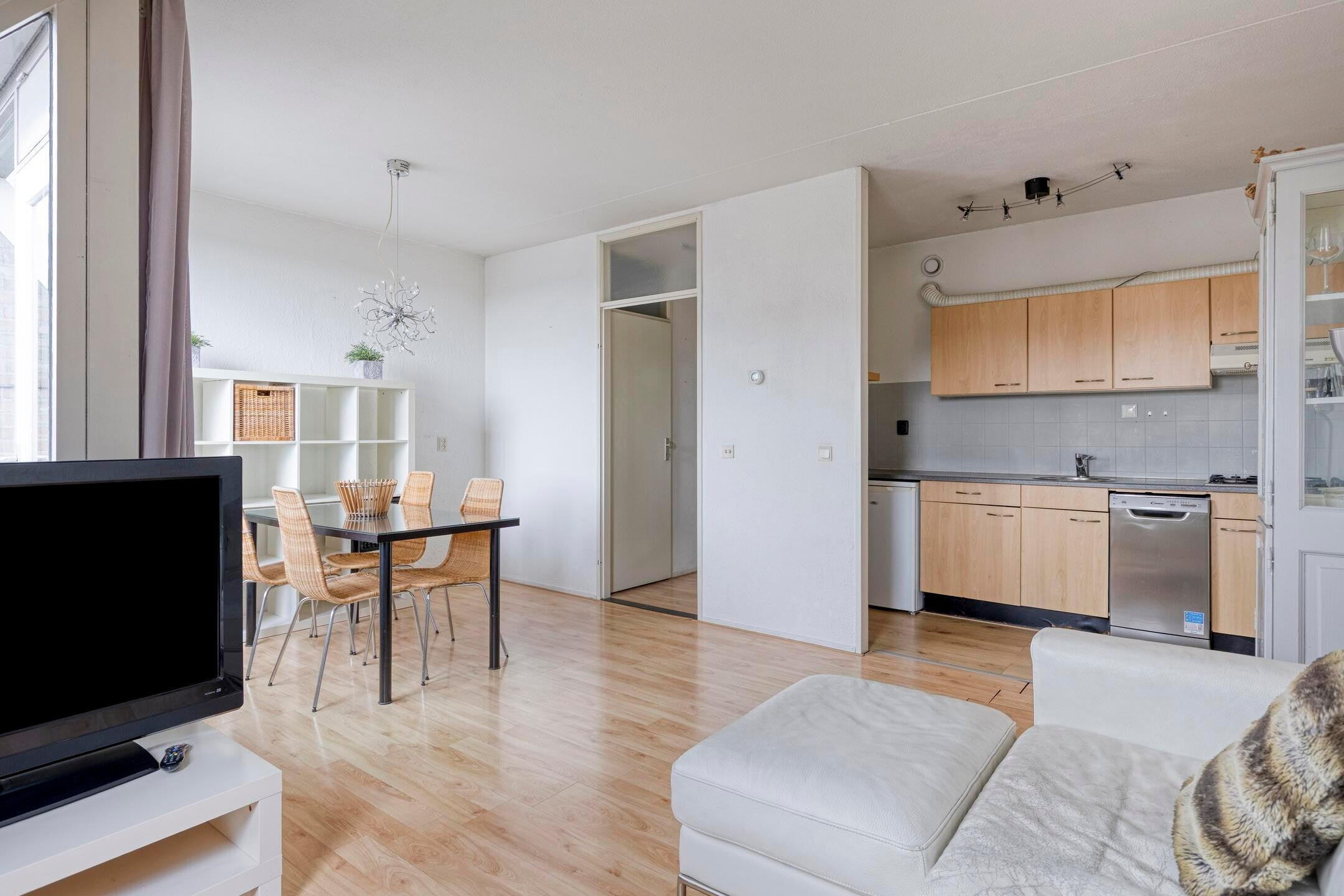 Via de gezamenlijke entree bereikt u met het trappenhuis de vierde verdieping. Bij binnenkomst in het appartement valt direct de praktische indeling op. De woonkamer van circa 20 m² is licht en biedt voldoende ruimte voor een gezellige zithoek en eettafel. Door de ligging op de bovenste verdieping is er geen bovenliggende bebouwing, wat bijdraagt aan het gevoel van rust en vrijheid.